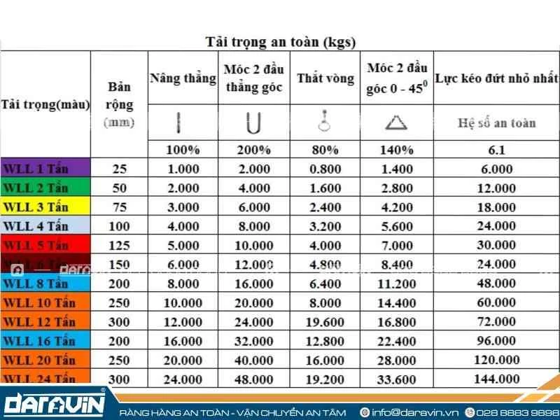 Để việc nhận diện tải trọng trở nên nhanh chóng và giảm thiểu sai sót, ngành công nghiệp nâng hạ toàn cầu sử dụng một hệ thống mã màu tiêu chuẩn cho cáp vải. Mỗi màu sắc tương ứng với một mức WLL cụ thể.