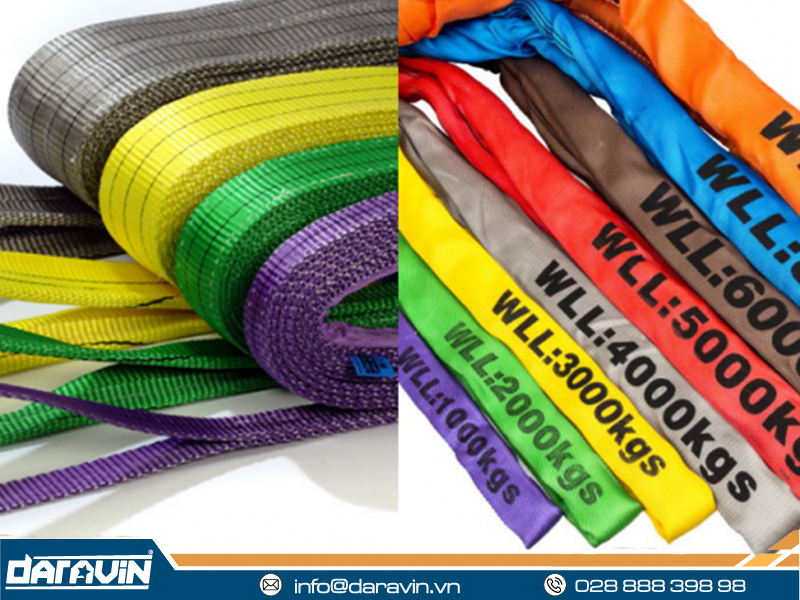 Nhận diện: Dây cẩu hàng được mã hóa màu theo tải trọng quốc tế (Ví dụ: Màu Tím = 1 tấn, Màu Xanh lá = 2 tấn, Màu Vàng = 3 tấn...).