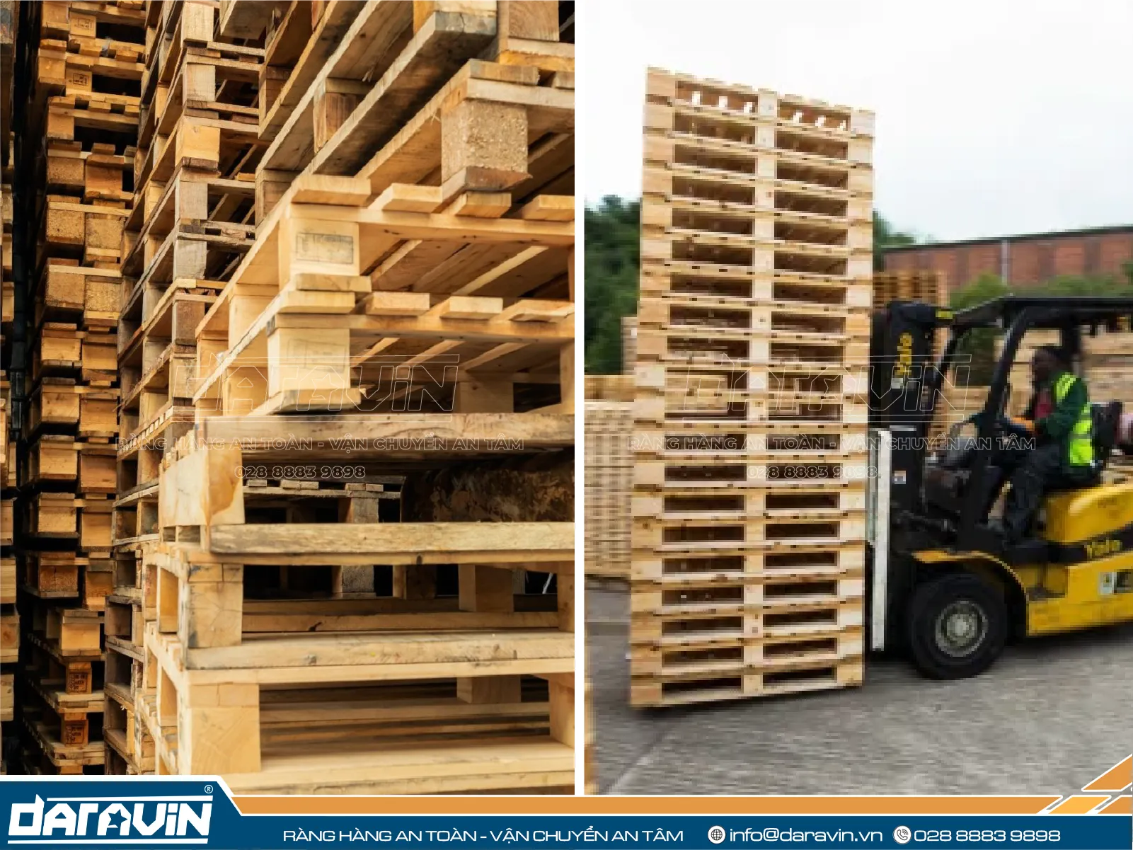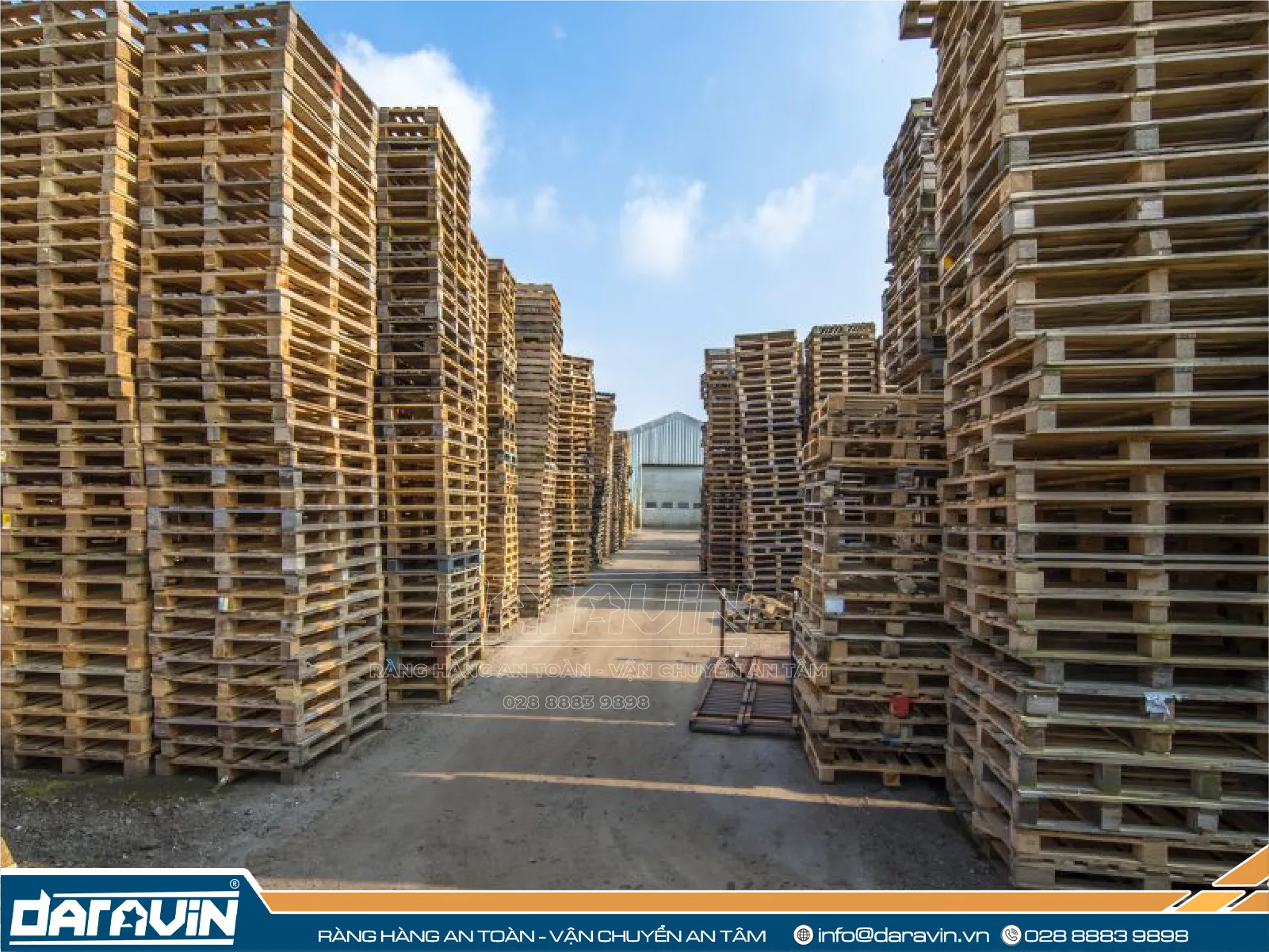 Xếp chồng hợp lý: Pallet được xếp chồng lên nhau một cách khoa học, có lớp đệm hoặc khoảng cách phù hợp để đảm bảo thông gió và tránh biến dạng.